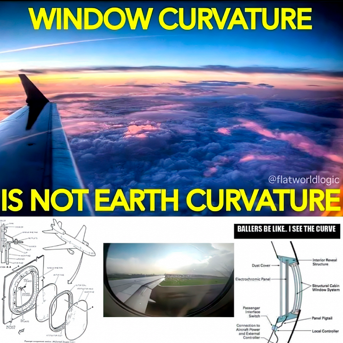 155) Some people claim to have seen the curvature of the Earth out their airplane windows. The glass used in all commercial airplanes, however, is curved to remain flush with the fuselage. This creates a slight effect mixed with confirmation bias people mistake for being the alleged curvature of the Earth. In actuality, the fact that you can see the horizon at eye-level at 35,000 feet out both port/starboard windows proves the Earth is flat. If the Earth were a ball, no matter how big, the horizon would stay exactly where it was and you would have to look DOWN further and further to see the horizon at all. Looking straight out the window at 35,000 feet you should see nothing but "outer-space" from the port and starboard windows, as the Earth/horizon are supposed to be BELOW you. If they are visible at eye level outside both side windows, it’s because the Earth is flat!